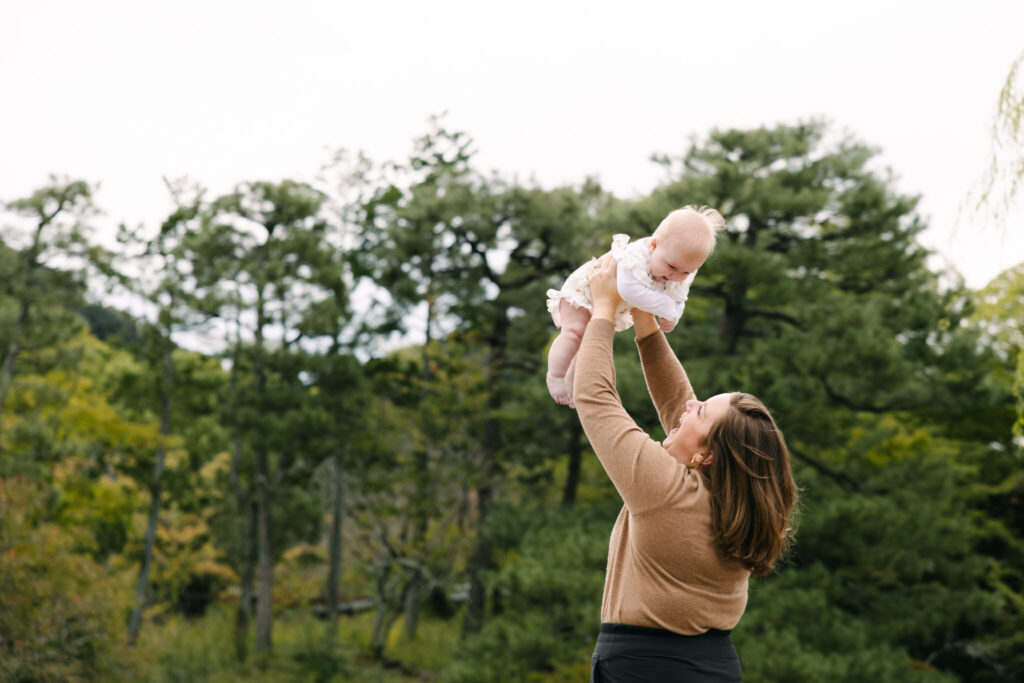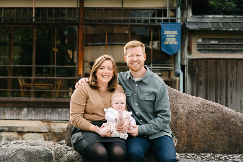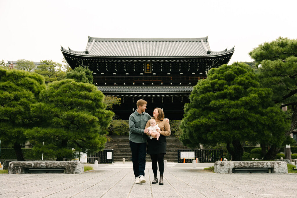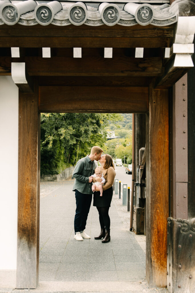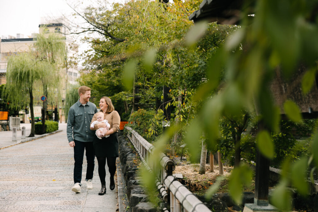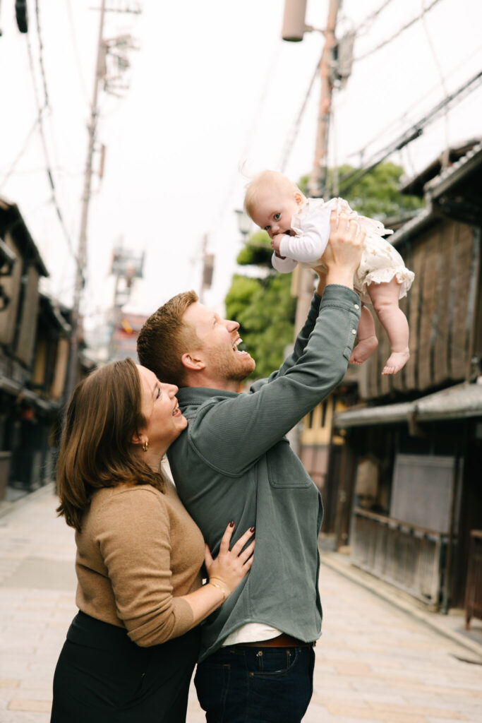 Both parents were calm, cheerful, and had beautiful smiles. They wanted photos with traditional Japanese buildings and scenery, so we began the shoot in a part of Gion that requires a photography permit. They loved the location, and we captured many different angles and styles there. I photographed the parents lifting the baby high to make her smile, and natural moments of them walking together with joy.