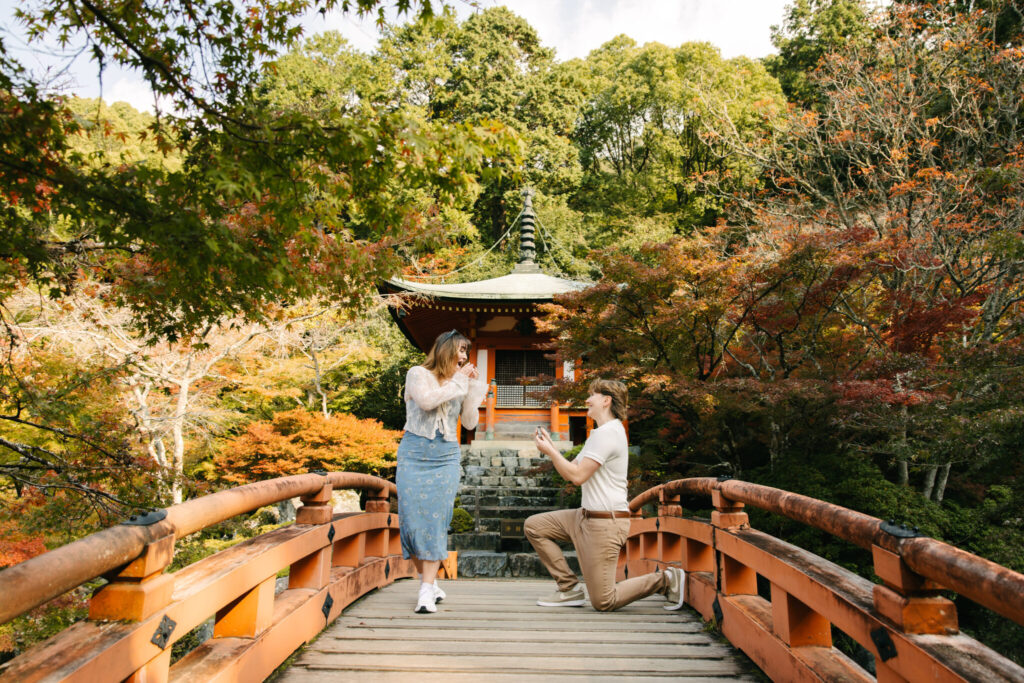 In early November, I had the chance to photograph a wonderful couple during their surprise proposal in Kyoto. To avoid the crowds, we planned a morning photoshoot around 9am. It worked perfectly because the area was still quiet, allowing the entire proposal to unfold smoothly and without any distractions.