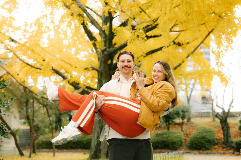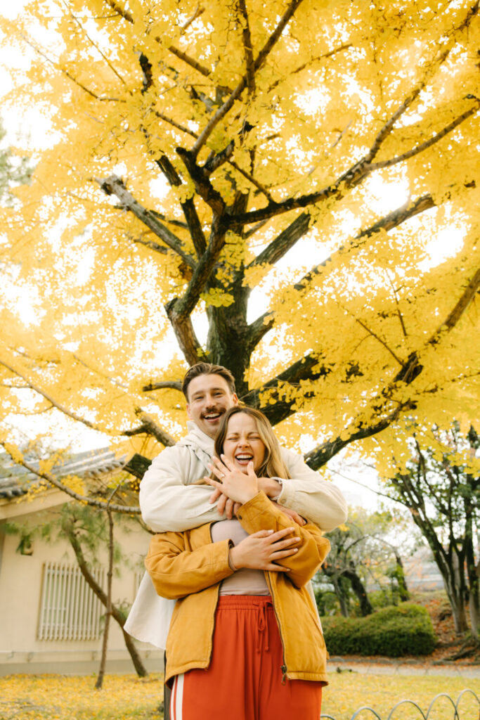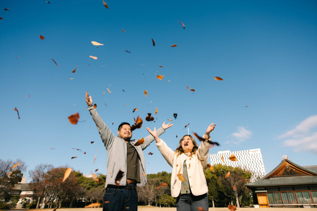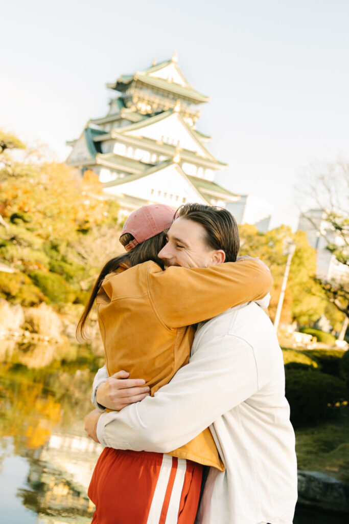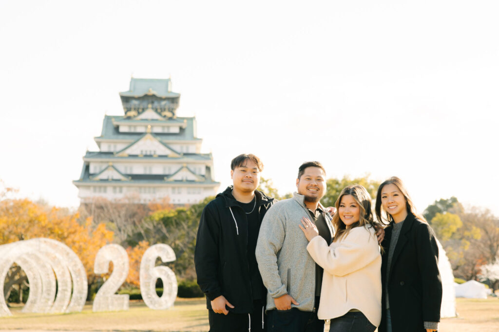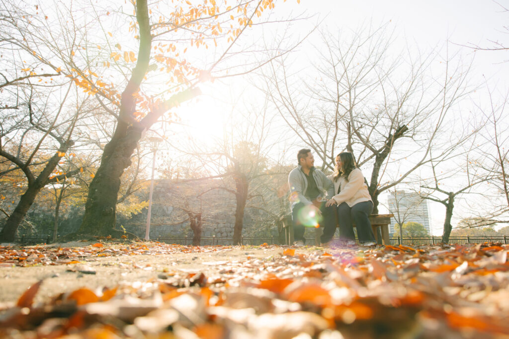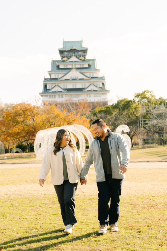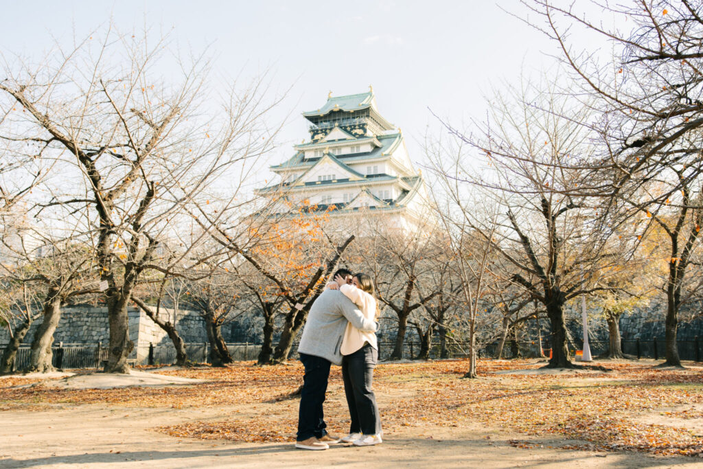 I recently had the pleasure of photographing a truly wonderful couple during their surprise proposal photo shoot at Osaka Castle Park. From the moment the proposal began until the very end of the session, their smiles were absolutely radiant, and their happiness filled the entire atmosphere around us.