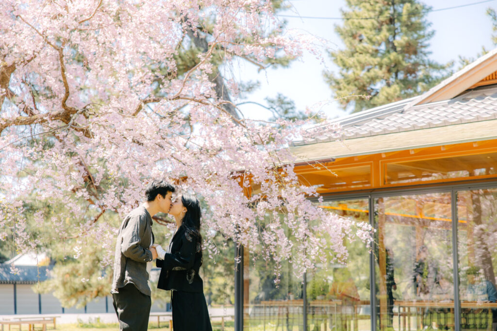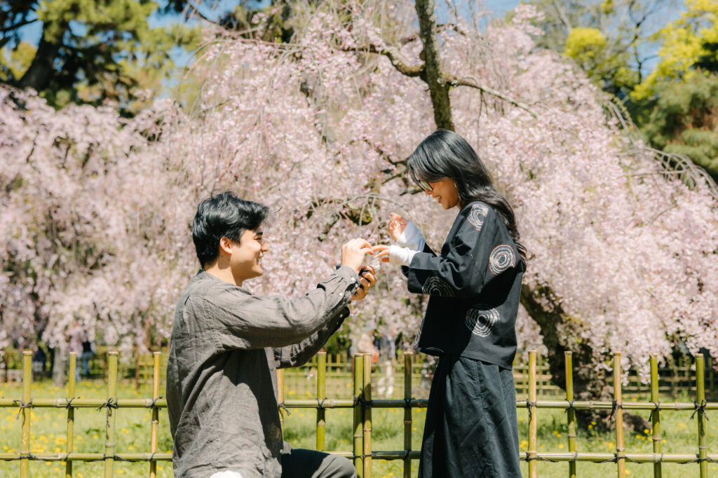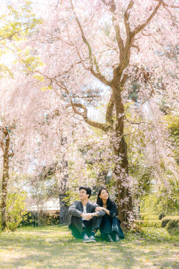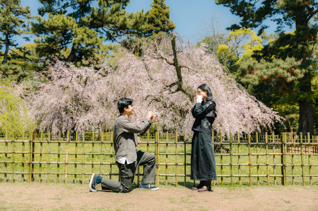 I recently photographed a surprise proposal for a very cheerful couple in a large park in Kyoto City. At that time, the late blooming weeping cherry blossoms were in full bloom, which made this proposal photoshoot truly beautiful and memorable. The soft pink sakura created the perfect romantic atmosphere for their special moment.