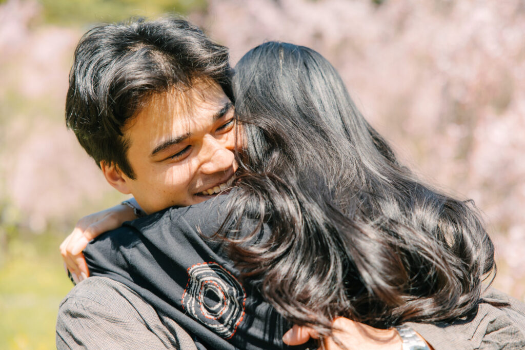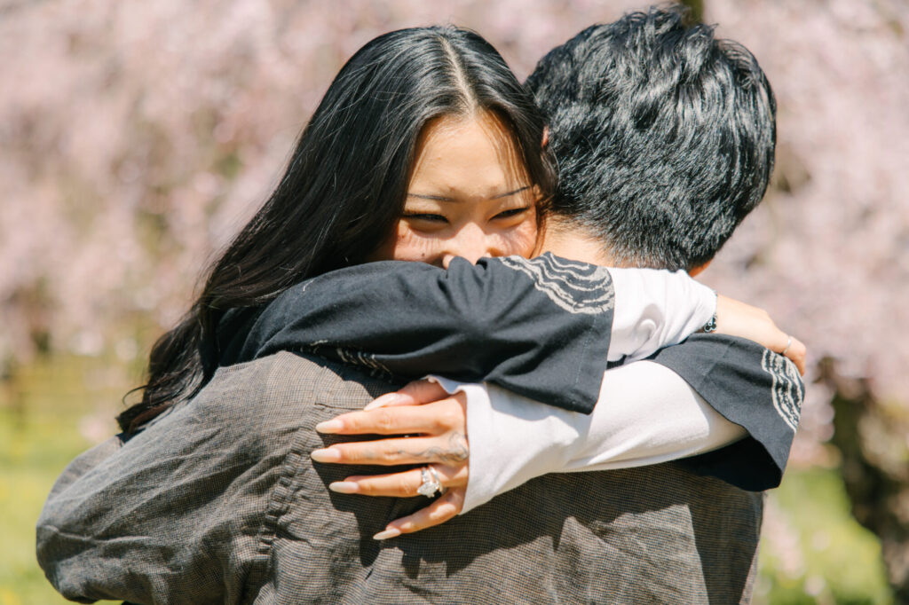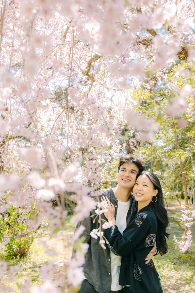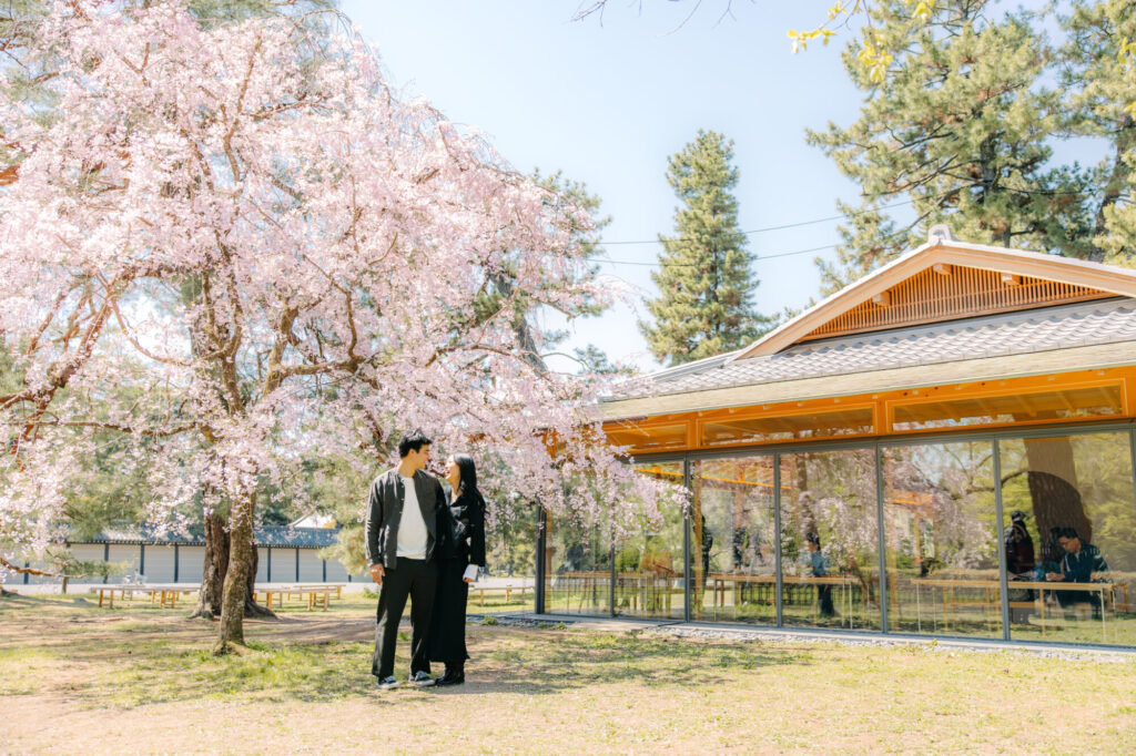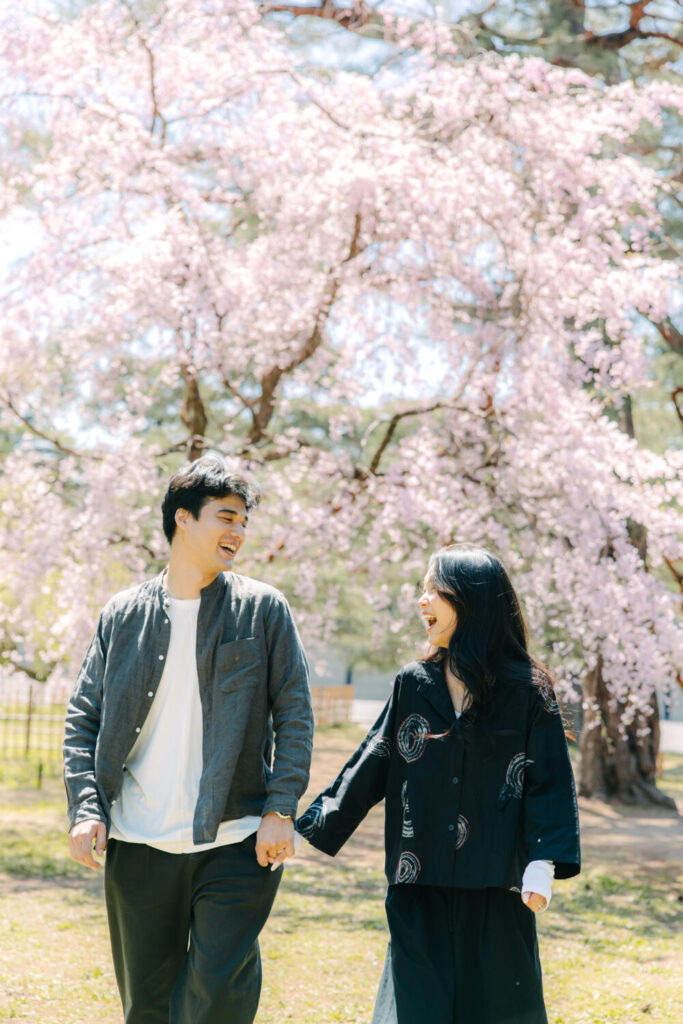I recently photographed a surprise proposal for a very cheerful couple in a large park in Kyoto City. At that time, the late blooming weeping cherry blossoms were in full bloom, which made this proposal photoshoot truly beautiful and memorable. The soft pink sakura created the perfect romantic atmosphere for their special moment.