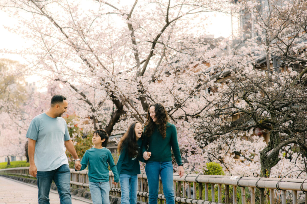 I had the pleasure of photographing a wonderful family in the Gion area of Kyoto during cherry blossom season. We met in the Gion Shirakawa area, where we were able to capture beautiful moments surrounded by fully blooming sakura. This area is known for its charming streets, traditional Kyoto buildings, and scenic canal lined with cherry trees, making it one of the best locations for photography in Kyoto.