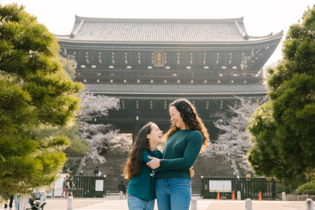 This photoshoot was also a special birthday celebration for the mother, so we explored several locations together. We took photos in front of a large temple gate and also visited Maruyama Park, another famous cherry blossom spot in Kyoto.