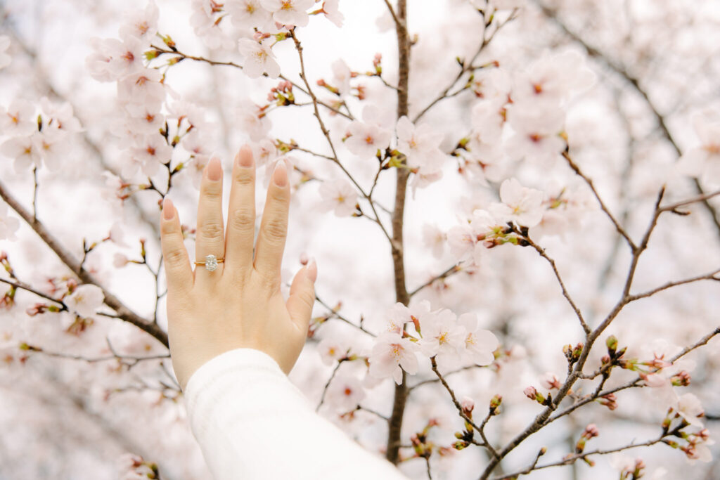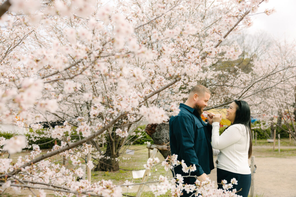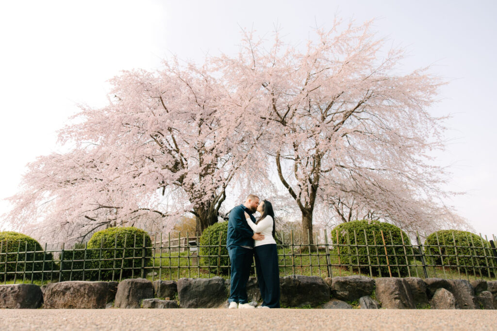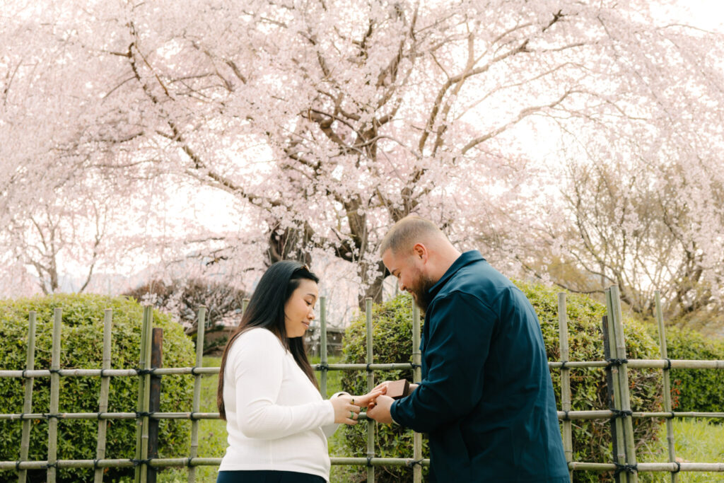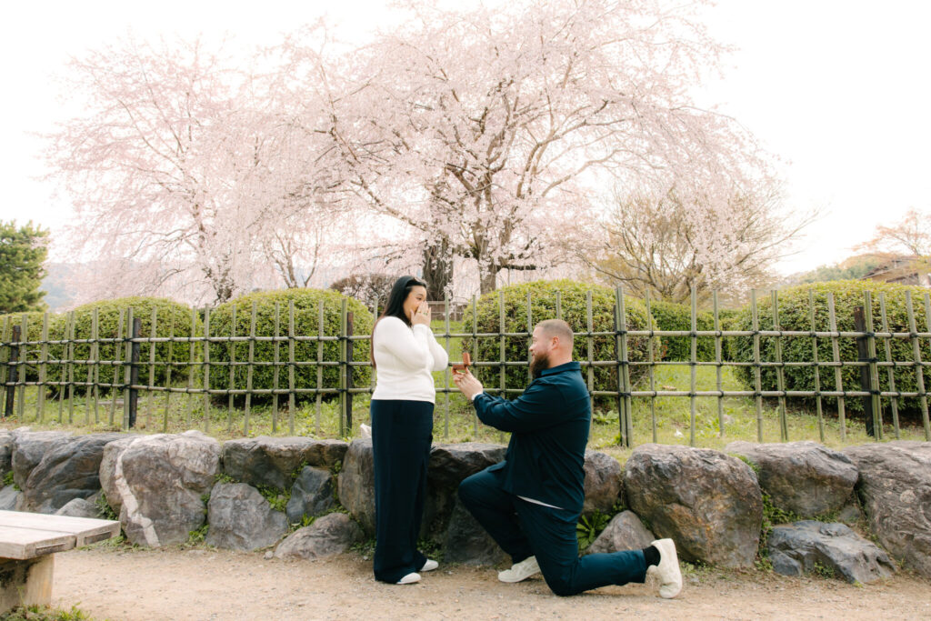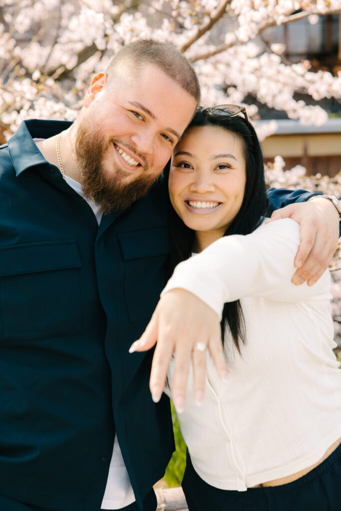 I had the pleasure of photographing a beautiful surprise proposal in the Gion area of Kyoto, one of the most iconic locations in Japan. The moment took place under fully bloomed cherry blossoms, making it a truly magical setting.