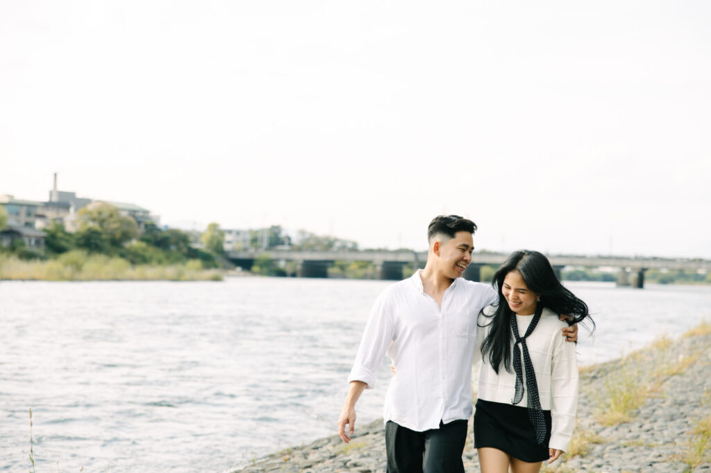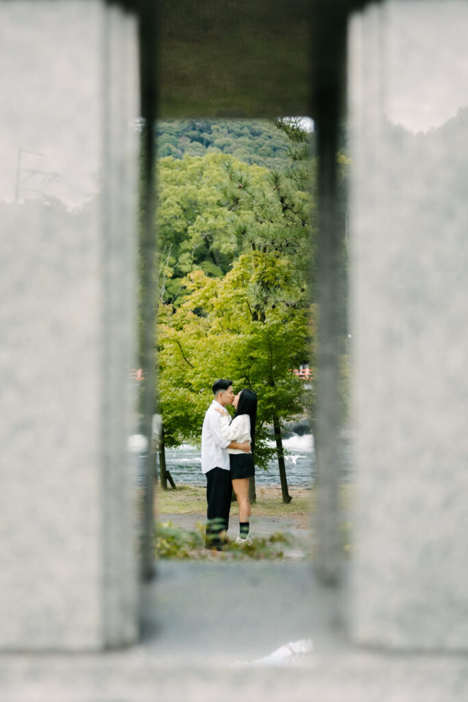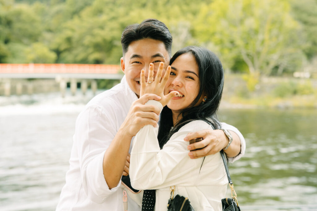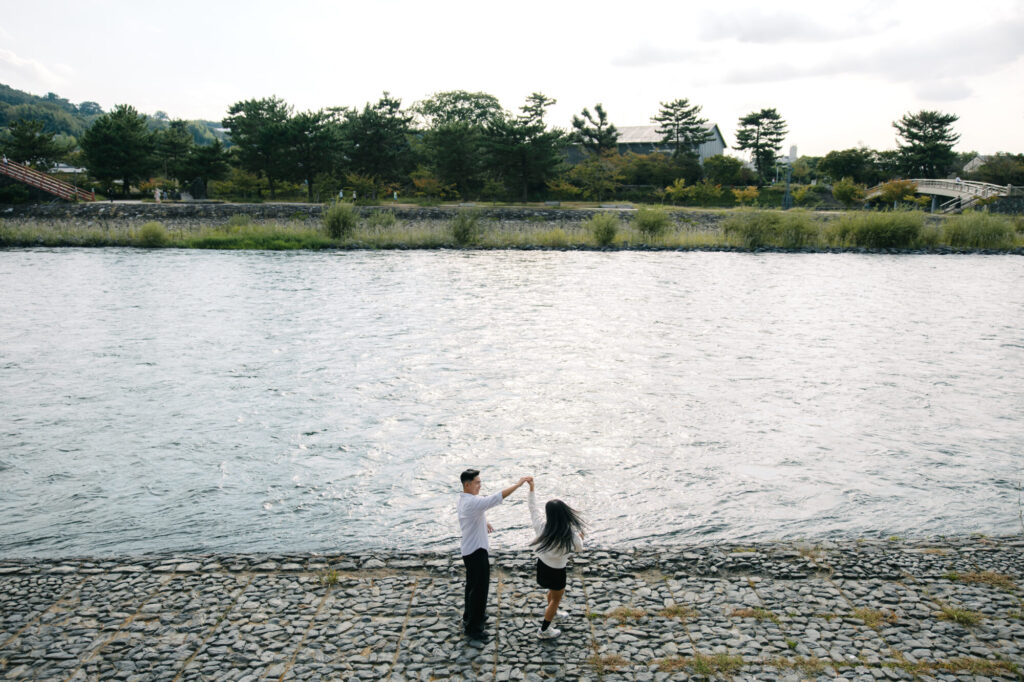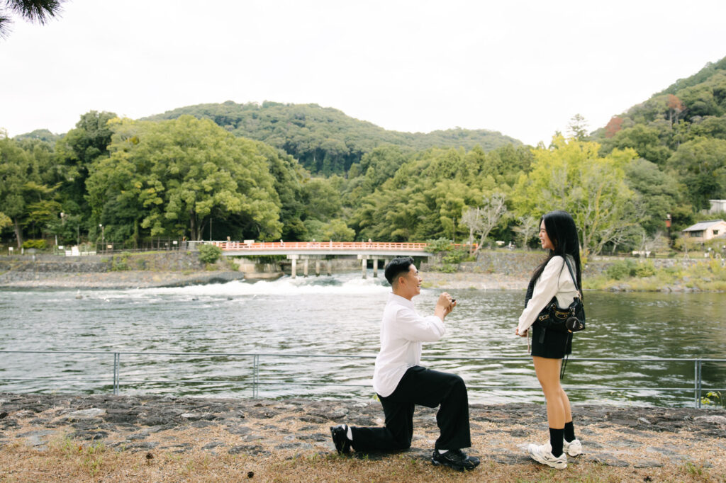 I recently had the pleasure of capturing a surprise proposal in a quiet area just outside central Kyoto. Since it was my first time shooting at this location, I scouted the area beforehand and selected a few of the best spots for photos. The site, by a beautiful river, was perfect for the proposal, and the couple planned with me to have the special moment there.