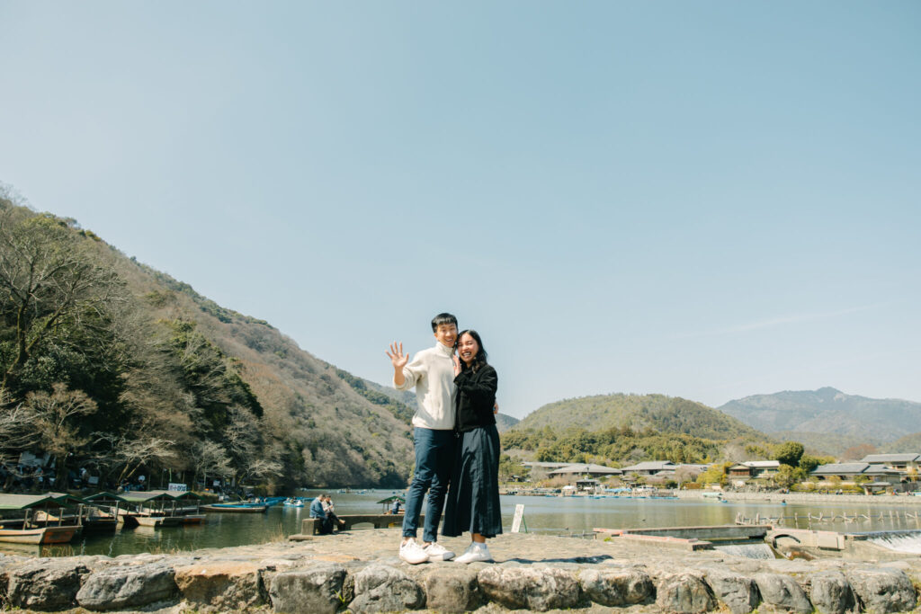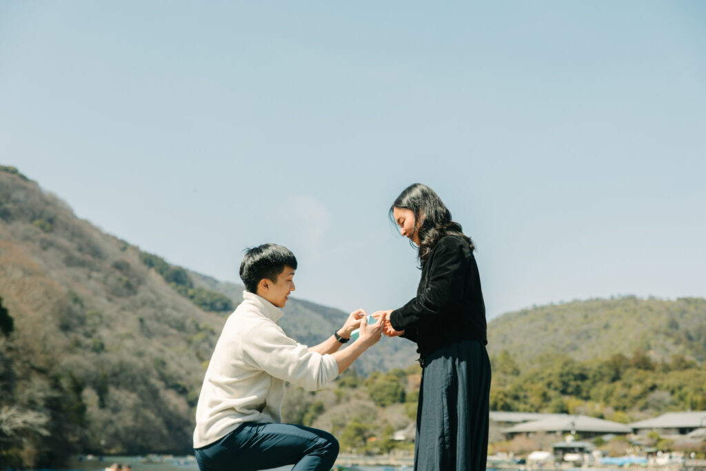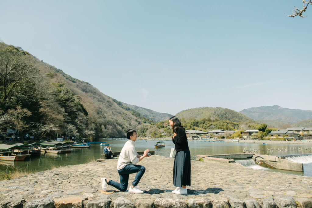 We carefully planned the proposal along the river in Arashiyama. As we had a limited amount of time, the groom-to-be and I created a detailed schedule to make sure everything would go smoothly on the day. Thankfully, they arrived right on time, and at that exact moment, the area became much quieter, allowing us to capture the proposal in a peaceful and intimate setting.