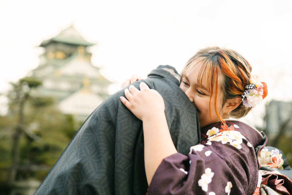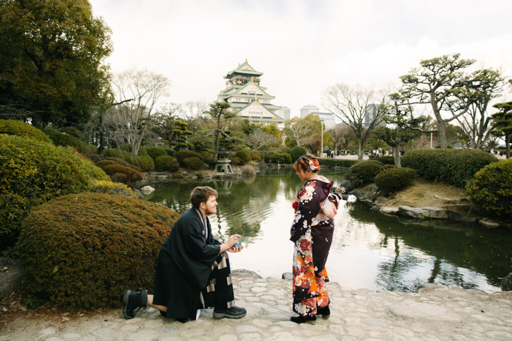 We planned the proposal carefully at Osaka Castle Park and told her that it would be a normal couple photoshoot. Wearing traditional kimono, they arrived excited for photos, not knowing that a proposal was about to happen. We met naturally, took a few casual photos, and then slowly moved to the special spot we had planned in advance.