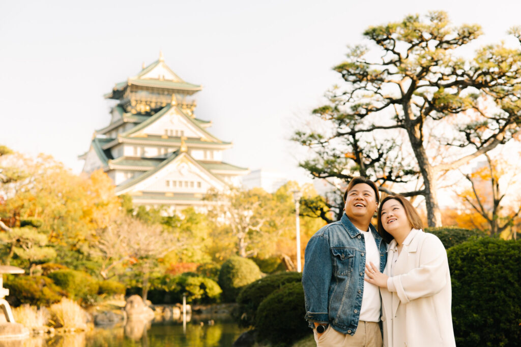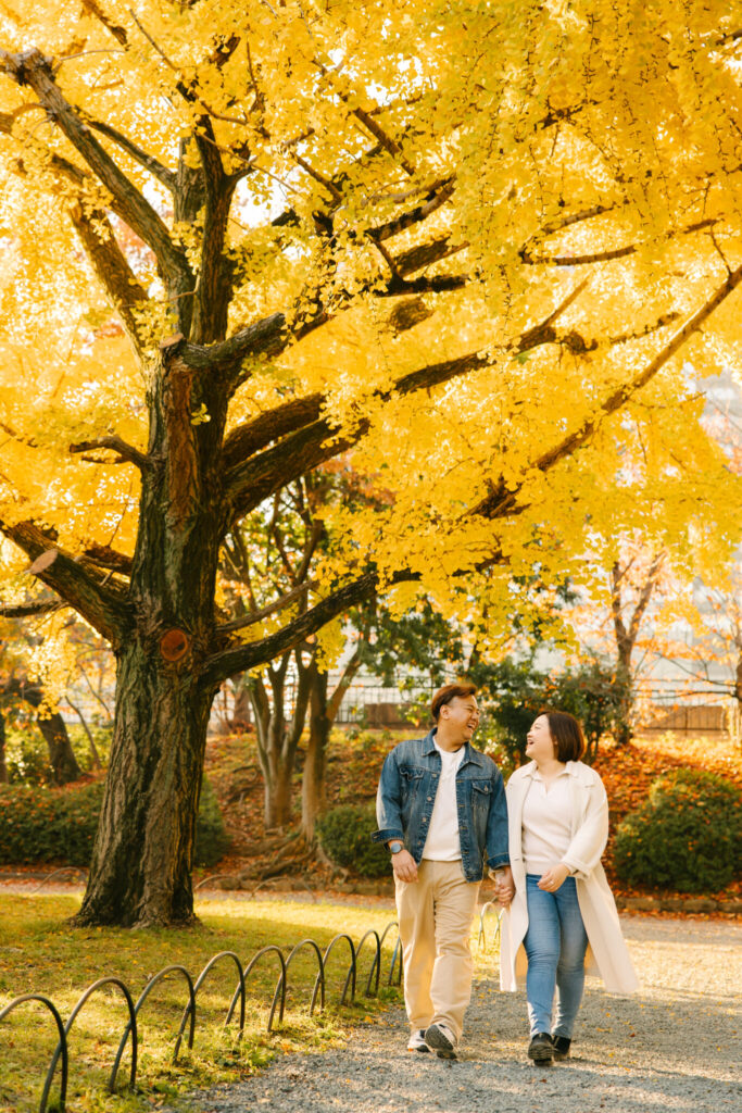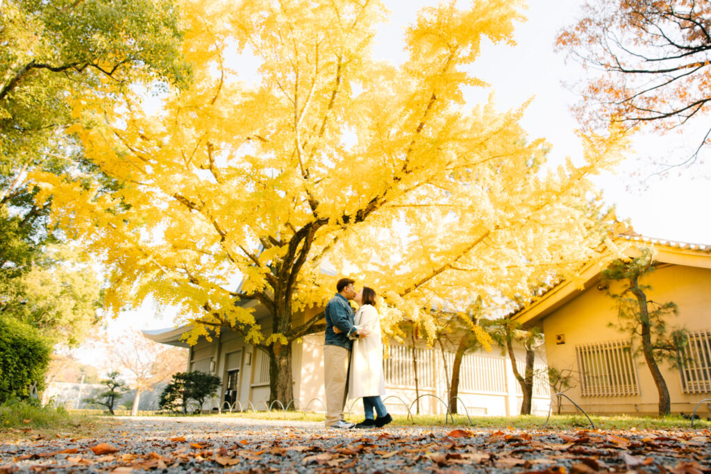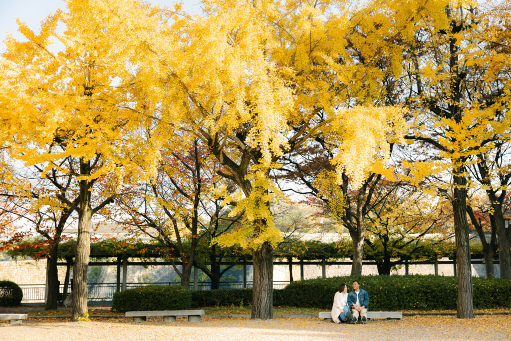 I recently had the pleasure of photographing an amazing couple photoshoot at Osaka Castle Park during one of the most beautiful autumn seasons. At this time of year, the ginkgo leaves turn a stunning golden yellow, creating a perfect backdrop for romantic photos. We took many wonderful photos with Osaka Castle in the background as well as among the colorful autumn trees.