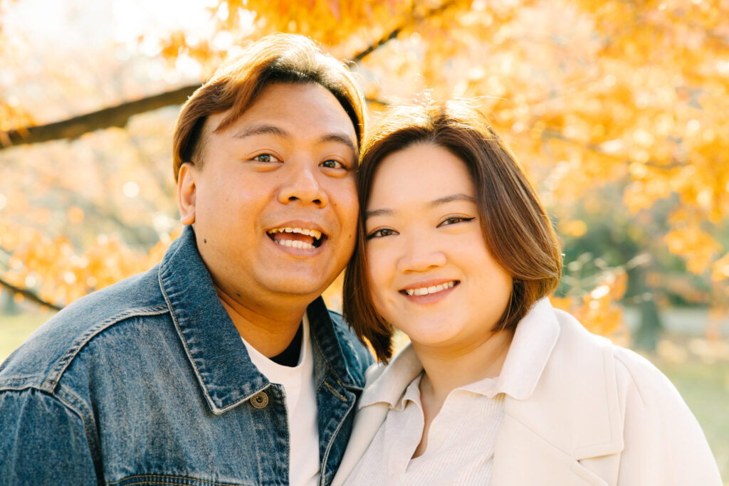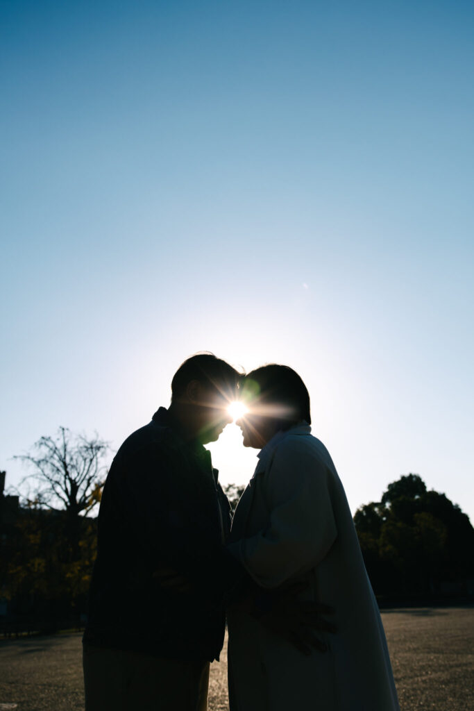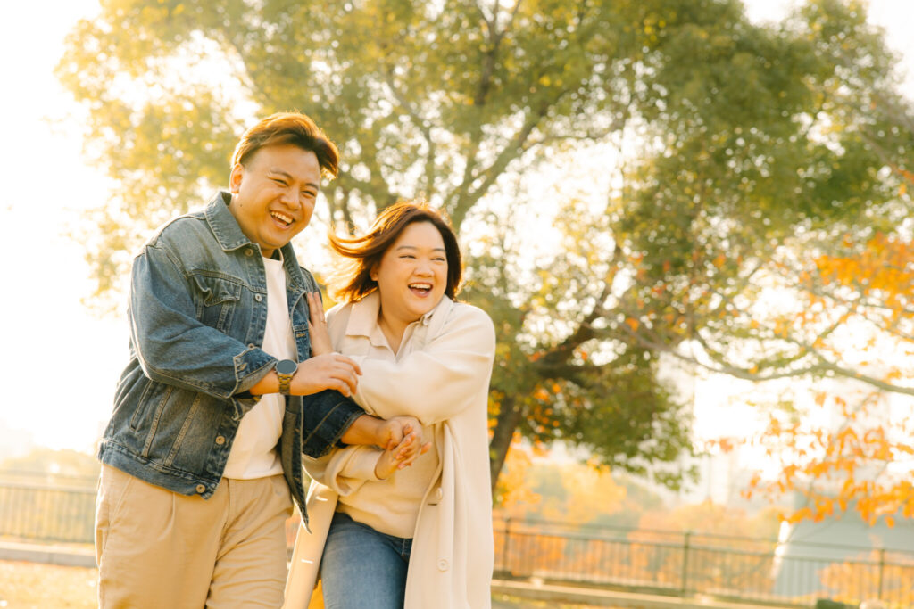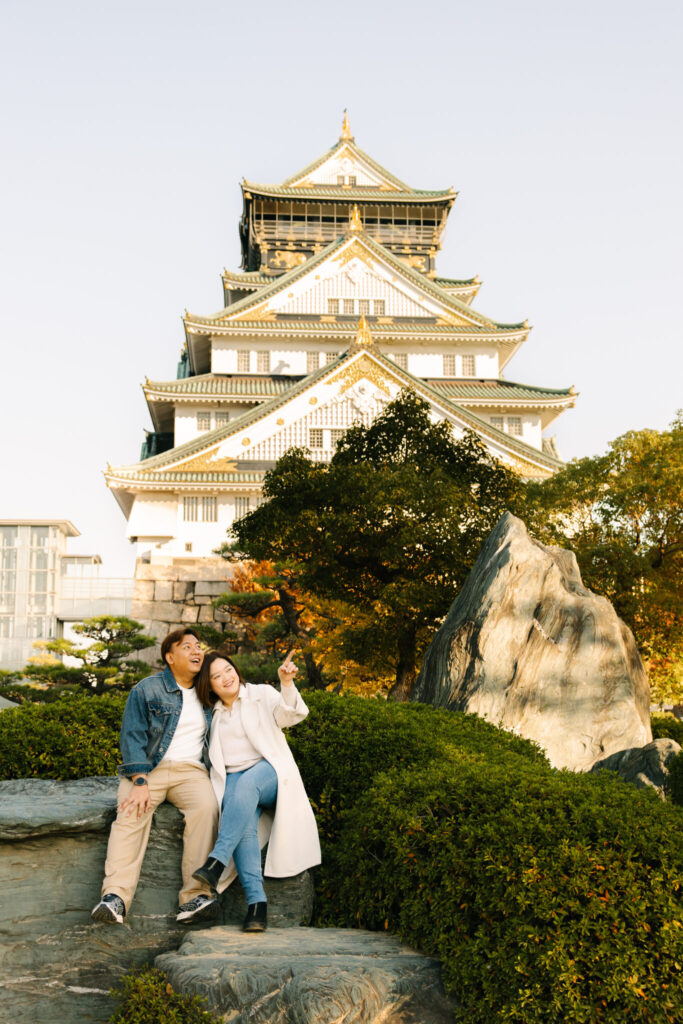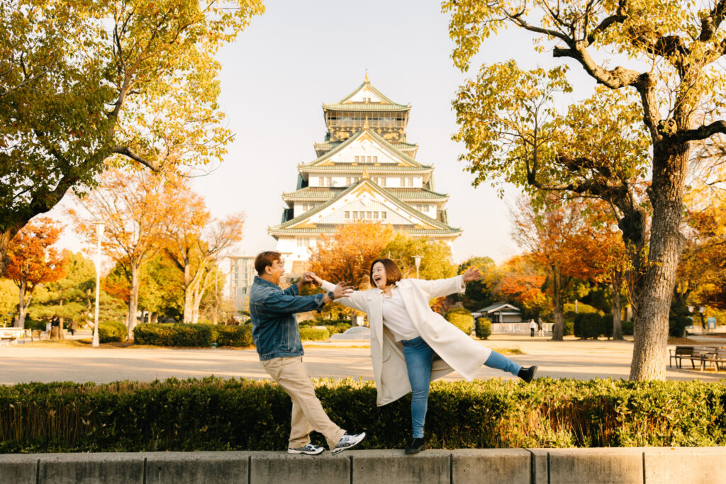 I recently had the pleasure of photographing an amazing couple photoshoot at Osaka Castle Park during one of the most beautiful autumn seasons. At this time of year, the ginkgo leaves turn a stunning golden yellow, creating a perfect backdrop for romantic photos. We took many wonderful photos with Osaka Castle in the background as well as among the colorful autumn trees.