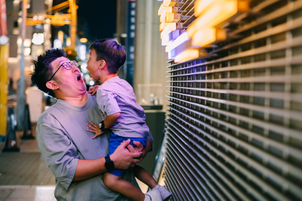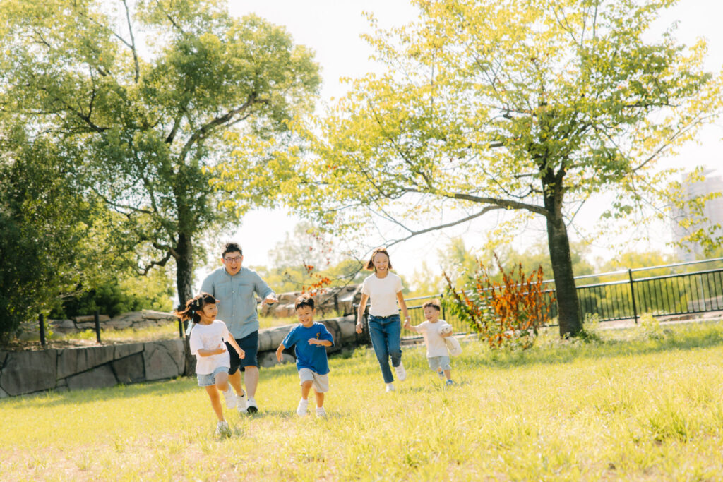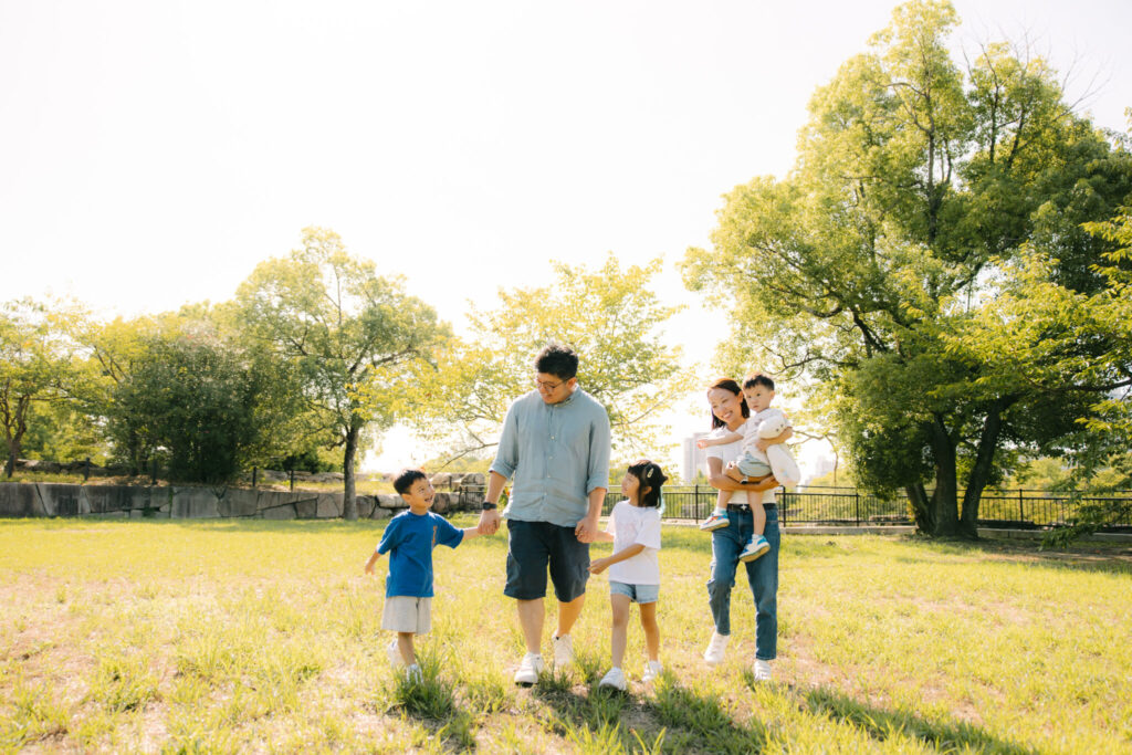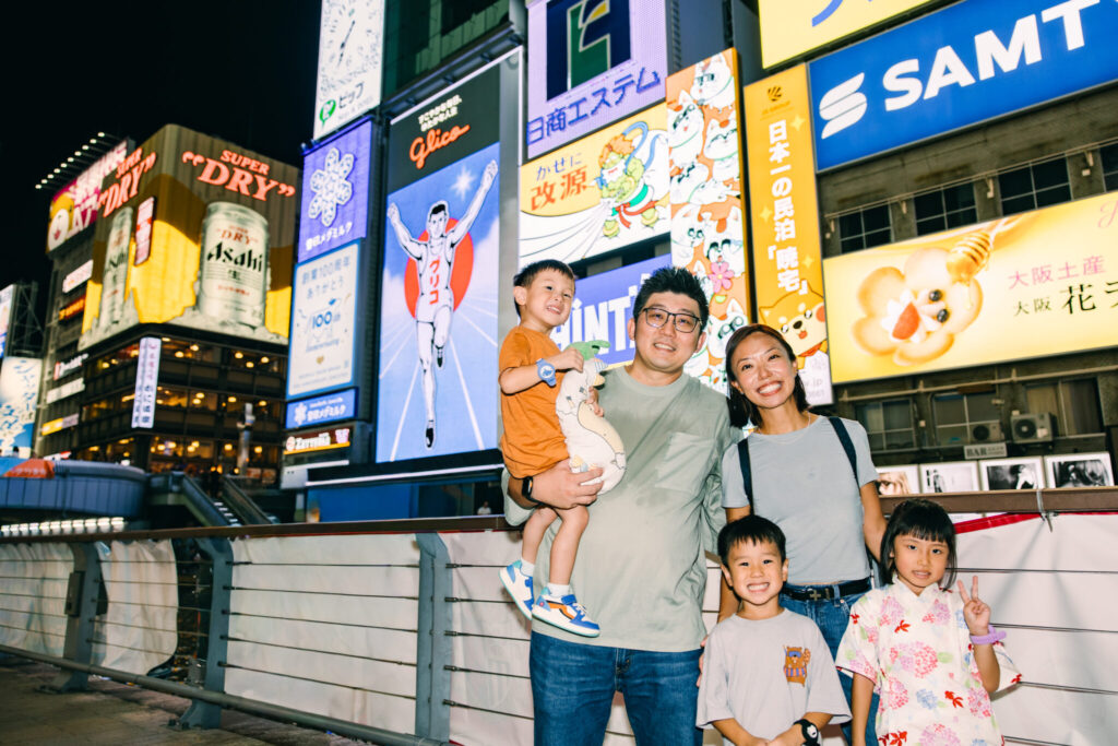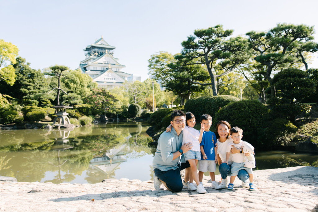 I had the joy of meeting an amazing family with two incredibly kind parents and three adorable children. They booked two sessions with me: a morning shoot at Osaka Castle Park and an evening session in the Namba area. From the first moment, the children were so friendly and immediately treated me like a friend, holding my hand as we walked—it was absolutely heartwarming.