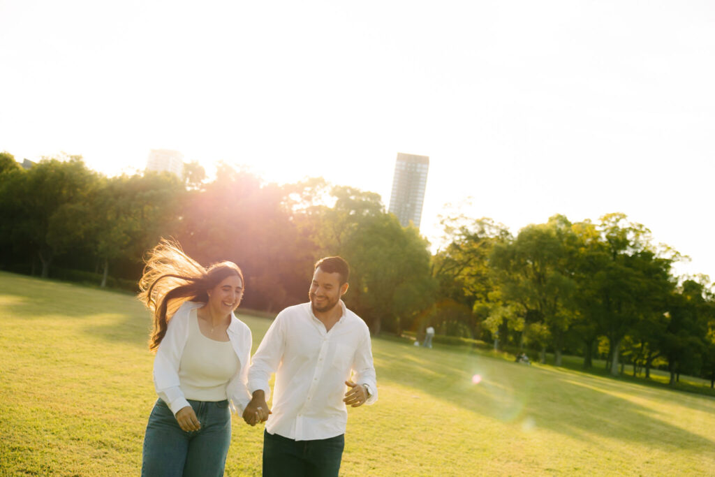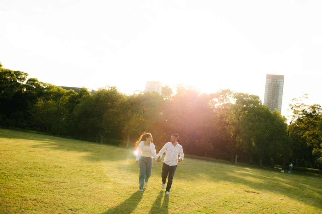 I recently had the pleasure of capturing a beautiful couple’s proposal at Osaka Castle Park. The timing was perfect, just before sunset, when the golden light made the park look magical. I arrived a little early to prepare, and thanks to the couple arriving on time, we were able to use the full hour for the photoshoot.
