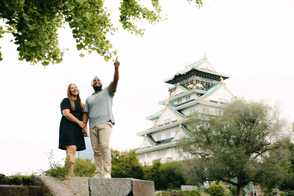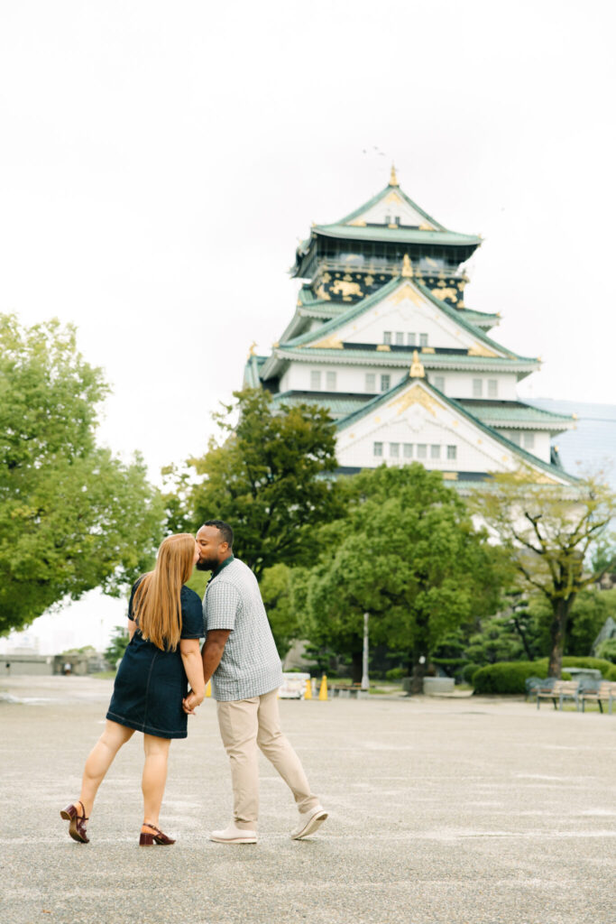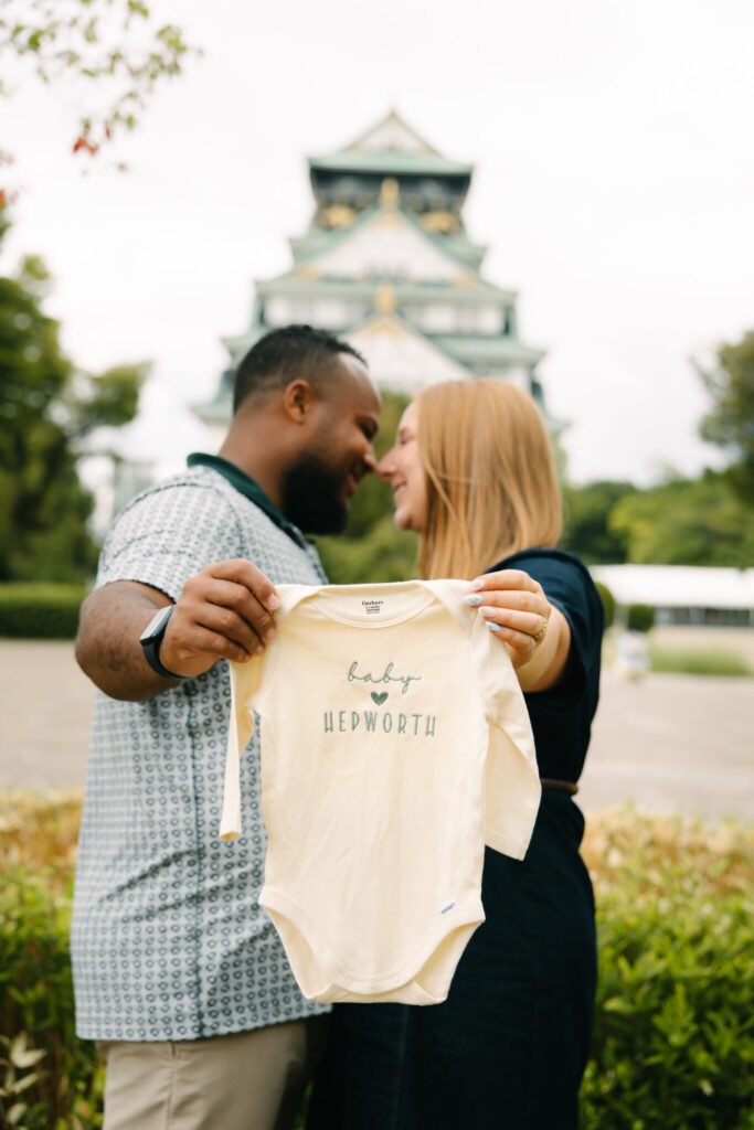 I recently photographed a beautiful couple for their maternity photoshoot at Osaka Castle Park. It had been raining earlier that day, so I was a little worried. But right when our session started, the rain stopped completely. The air felt fresh and clear after the rain, and with almost no one around, it turned into the perfect setting for a relaxed and intimate photoshoot.