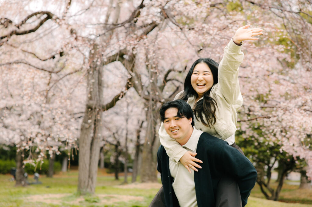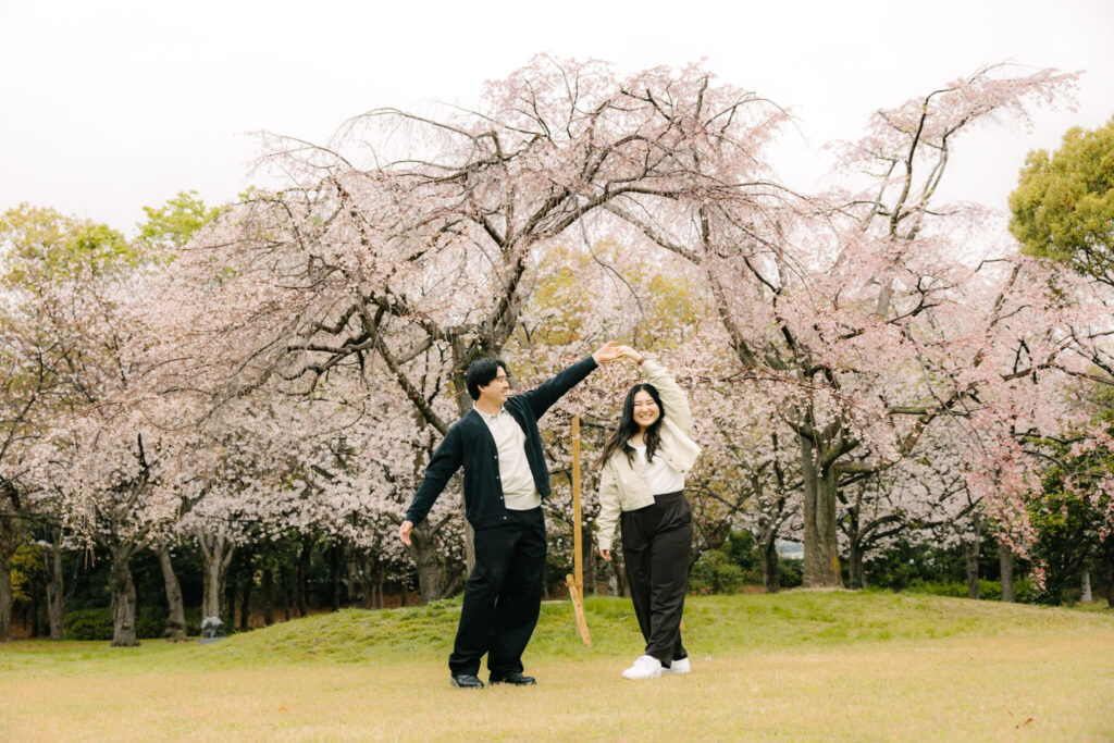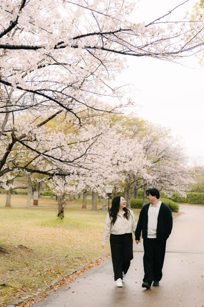 We had been checking the weather forecast many times in advance, but unfortunately, it rained on the day of the photoshoot. Thankfully, it was only a light rain, so we decided to go ahead with the session. Because of the weather, the park was not too crowded, and the cherry blossoms were in full bloom, creating an incredibly beautiful and peaceful atmosphere.
