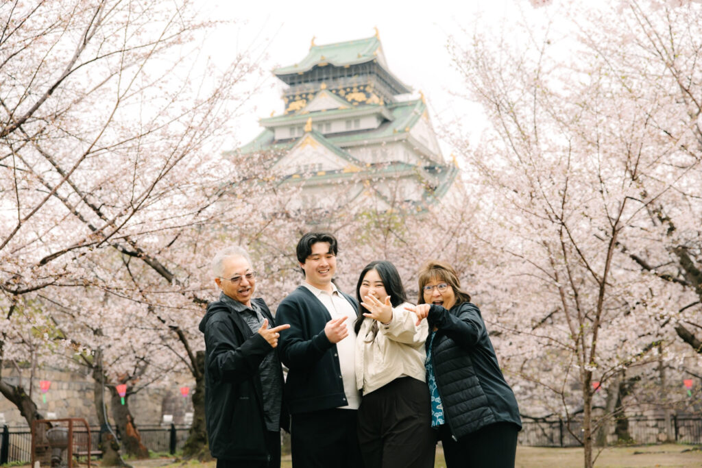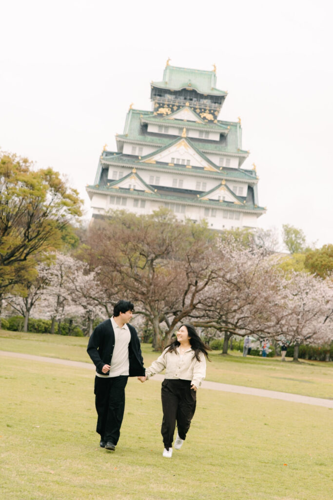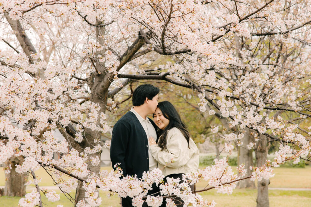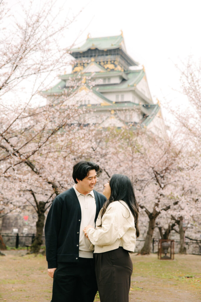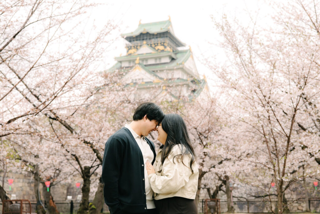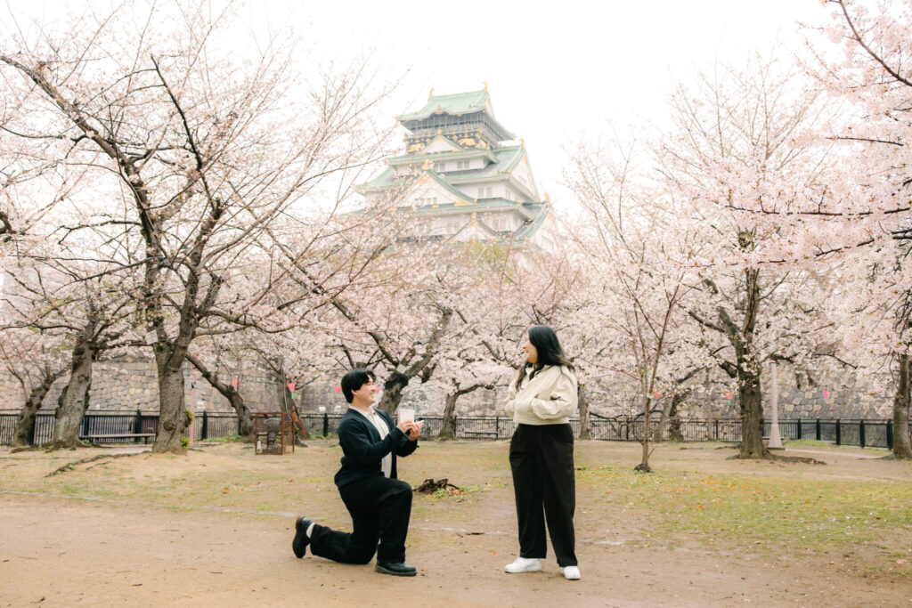 We captured a beautiful surprise proposal during cherry blossom season at Osaka Castle Park in Osaka.